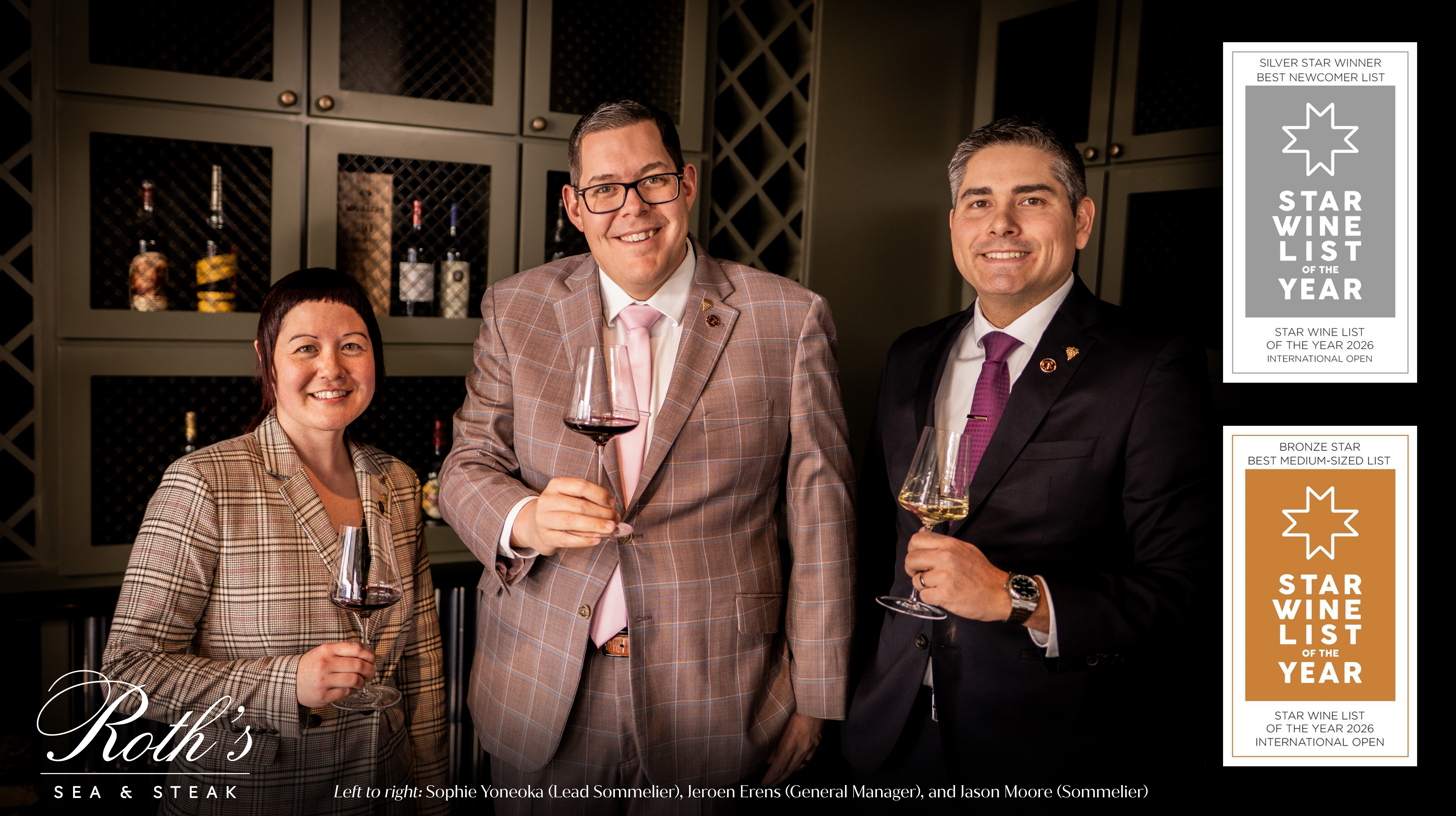 “When we built the wine program at Roth’s, we wanted it to feel thoughtful from the beginning, not just impressive on paper,” said Jeroen Erens, General Manager and Wine Director at Roth’s Sea & Steak. “We put a lot of focus on small estates and winemakers who are doing things the right way, especially those committed to organic and sustainable practices. That naturally led us to limited production bottles that are genuinely hard to find, along with a few selections guests can only enjoy here, like our custom Roth’s Founders Cut. Every wine earns its place for its quality, but also for the story behind it, the people, the history, and the craftsmanship in every vintage. Being named a finalist by Star Wine List is a tremendous honor and a meaningful reflection of the passion our team brings to the dining room every night.”