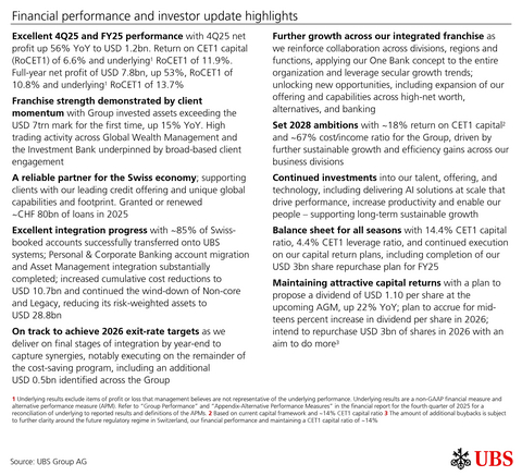 Excellent 4Q25 and FY25 performance with 4Q25 net profit up 56% YoY to USD 1.2bn. Return on CET1 capital (RoCET1) of 6.6% and underlying1 RoCET1 of 11.9%. Full-year net profit of USD 7.8bn, up 53%, RoCET1 of 10.8% and underlying1 RoCET1 of 13.7%
