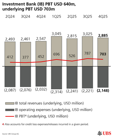 Reported revenues in 4Q25 were USD 12,145m, up 4% YoY. On an underlying basis, revenues increased by 10% to USD 12,199m, notably driven by increases in GWM’s recurring net fee income and transaction-based income, Investment Bank’s (IB) Global Markets revenues, and AM’s net management fee income.
