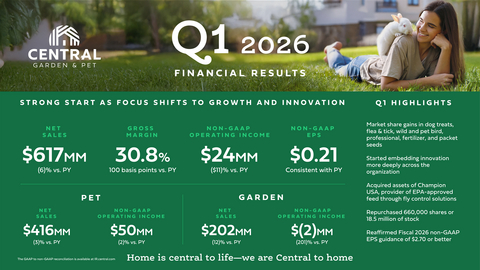 WALNUT CREEK, Calif.--(BUSINESS WIRE)--Central Garden & Pet Company (NASDAQ: CENT) (NASDAQ: CENTA) (“Central”), a leading consumer goods company in the pet and garden industries, today announced financial results for its fiscal 2026 first quarter ended December 27, 2025.