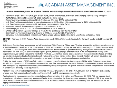 BOSTON--(BUSINESS WIRE)--Acadian Asset Management Inc. (NYSE: AAMI) today announced its results for the fourth quarter ended December 31, 2025.