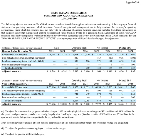 WOKING, England--(BUSINESS WIRE)--Linde plc (Nasdaq: LIN) today reported fourth-quarter 2025 net income of $1,530 million and diluted earnings per share of $3.26, down 11% and 9%, respectively. Excluding Linde AG purchase accounting impacts and restructuring charge impacts, adjusted net income was $1,968 million, up 4% versus prior year. Adjusted earnings per share was $4.20, 6% above prior year.