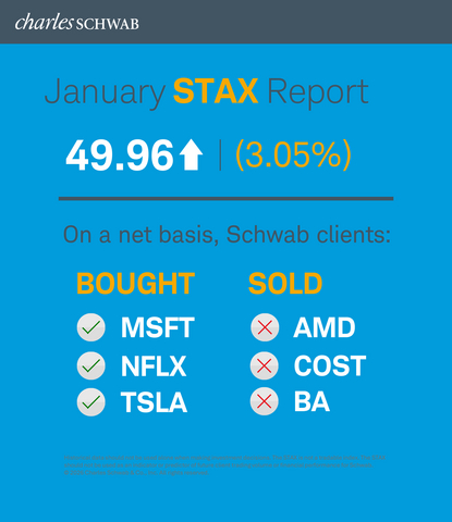 WESTLAKE, Texas--(BUSINESS WIRE)--The Schwab Trading Activity Index™ (STAX) increased to 49.96 in January, up from its score of 48.48 in December. The only index of its kind, the STAX is a proprietary, behavior-based index that analyzes retail investor stock positions and trading activity from Schwab’s millions of client accounts to illuminate what investors were actually doing and how they were positioned in the markets each month.