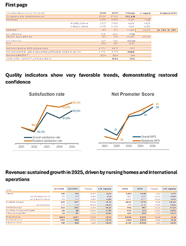 Laurent Guillot, Chief Executive Officer: "We are proud of our performance in 2025, with results that demonstrate that we are delivering on our commitments and in line with our strategy. The recent announcement of the creation of our property company Isemia, the completion of our disposal plan and the strengthening of our balance sheet structure already allow us to anticipate an accelerated exit from the safeguard plan in record time. This symbolises the normalisation of our Group's situation after three years devoted to its restructuring. Furthermore, the strong improvement in satisfaction and quality indicators confirms that the relationship of trust with our residents, patients and their families has now been restored, thanks to the unfailing commitment of the teams in our facilities. I would like to express my sincere thanks to them.