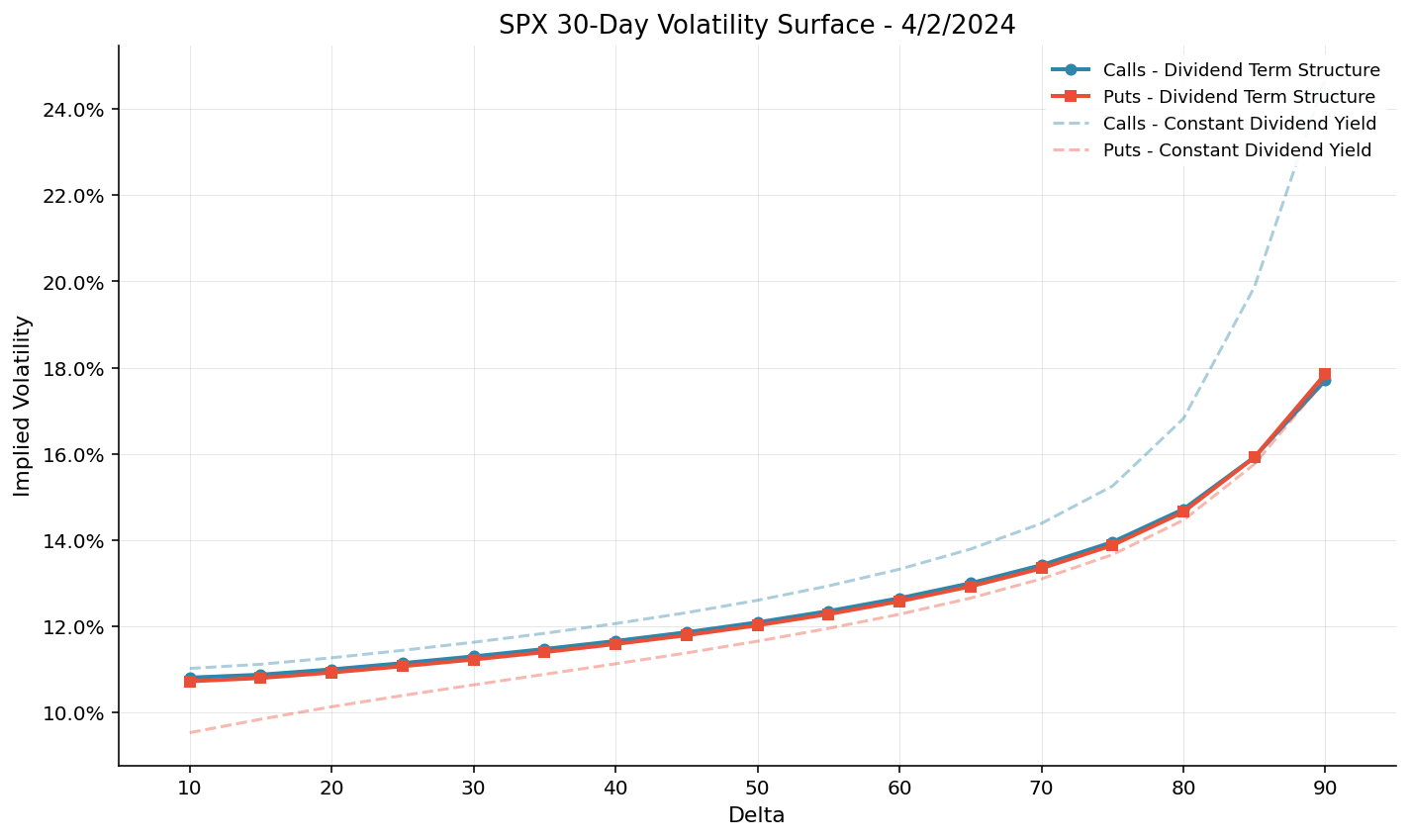 IvyDB US 7.0 provides both calculation methodologies: the implied index yield term structure produces near-identical call and put volatilities across all deltas, while the constant dividend yield surface is included for backward compatibility. The graph displays SPX volatility surface by delta for both calls (blue) and puts (red). Solid lines represent the dividend term structure methodology, where call and put converge tightly across all strikes. Dashed lines show constant dividend yield volatilities. Data source: OptionMetrics.
