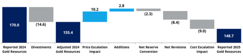 - 2024年からの変動は主に資産売却(860万オンス)によるものであり、これに続いて採掘による減耗、ヤナコチャ硫化鉱(サルファイド)プロジェクトの埋蔵量から資源量への再分類、ならびにコスト上昇の前提が影響しました。一方で、金価格前提の引き上げ、資源量から埋蔵量への転換、およびブルースジャック、タナミ、リヒル、アハフォ・ノース、アハフォ・サウスにおけるその他の前向きな改訂がこれらを一部相殺しています