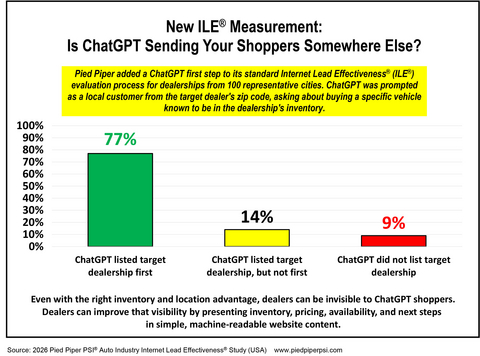 To establish a benchmark, Pied Piper added a ChatGPT first step to its standard ILE® evaluation process for a representative sample of dealerships. For each dealership, ChatGPT was prompted as a local customer from the target dealer’s zip code, asking about a specific vehicle known to be in the dealership’s inventory. The results reveal clear visibility gaps and opportunities for dealerships to track and improve how they appear in AI-driven searches.