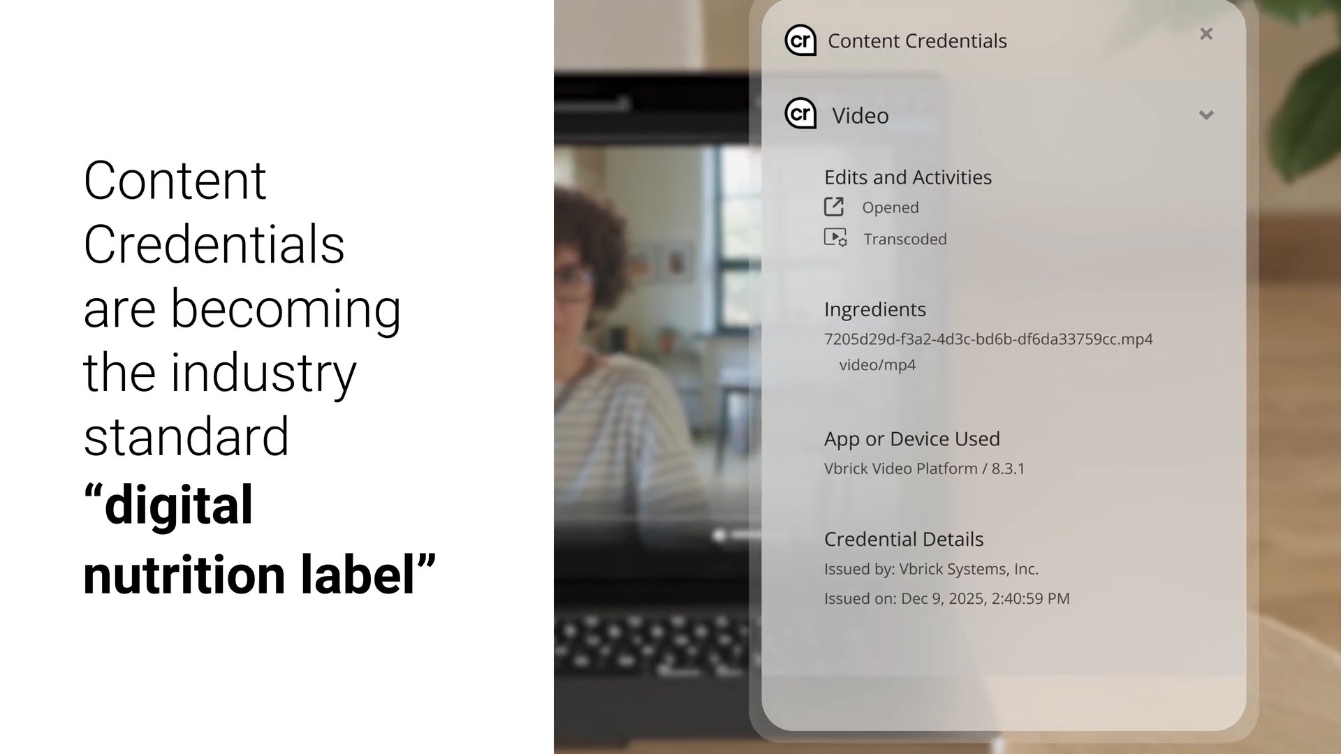 The C2PA Conformance Program ensures that products correctly implement the Content Credentials specification and meet strict security requirements for generating and validating provenance data. Vbrick is among a small, select group of technology providers eligible to use the Content Credentials branding and the “Cr” pin within its platform.