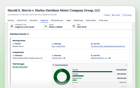 - Precision Filtering: Search or filter by judgment type or specific dollar amounts, as well as key players including attorneys, law firms, judges, parties, and more