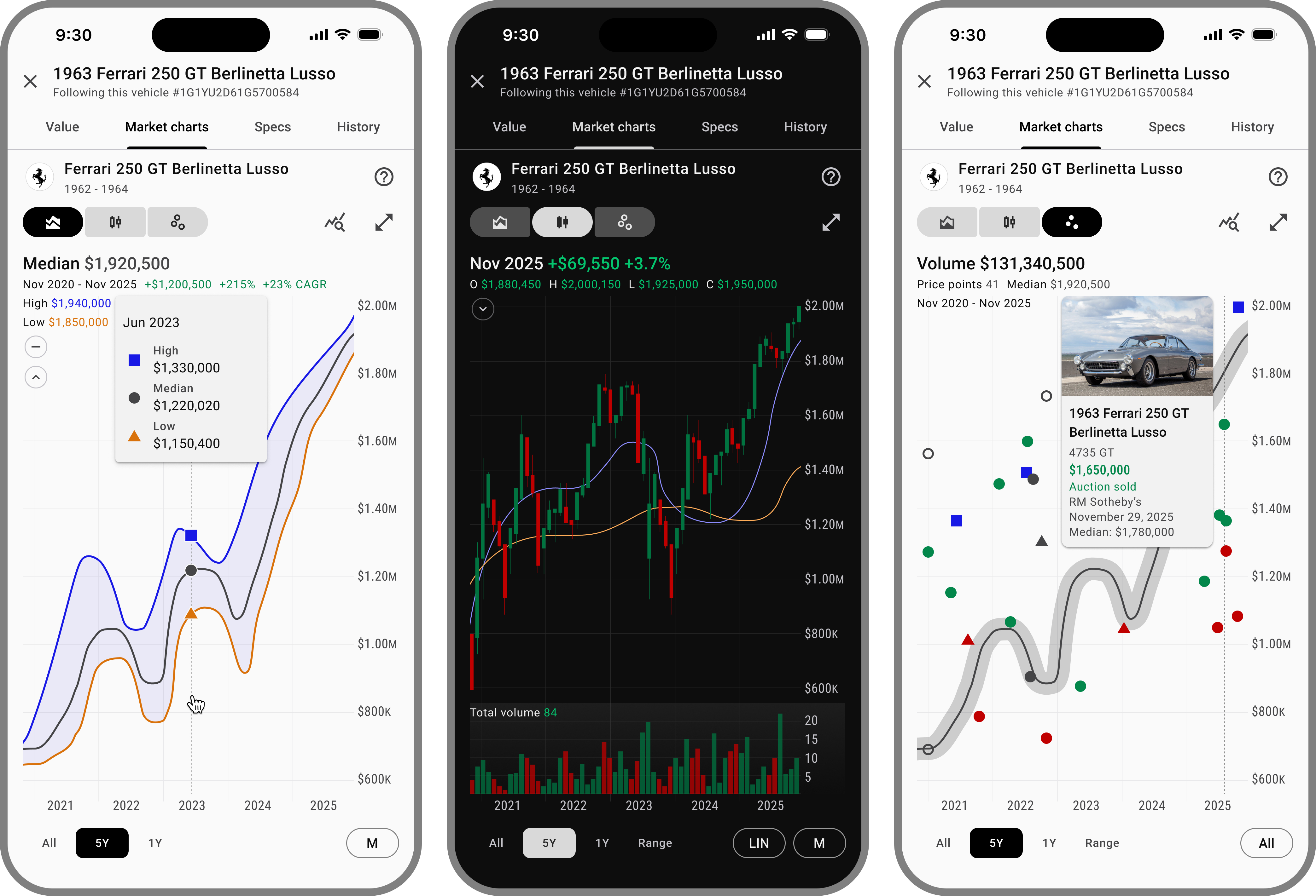 The market distribution chart, for example, illustrates how a vehicle’s value has fluctuated over time with points representing actual VIN numbers and purchase prices.
