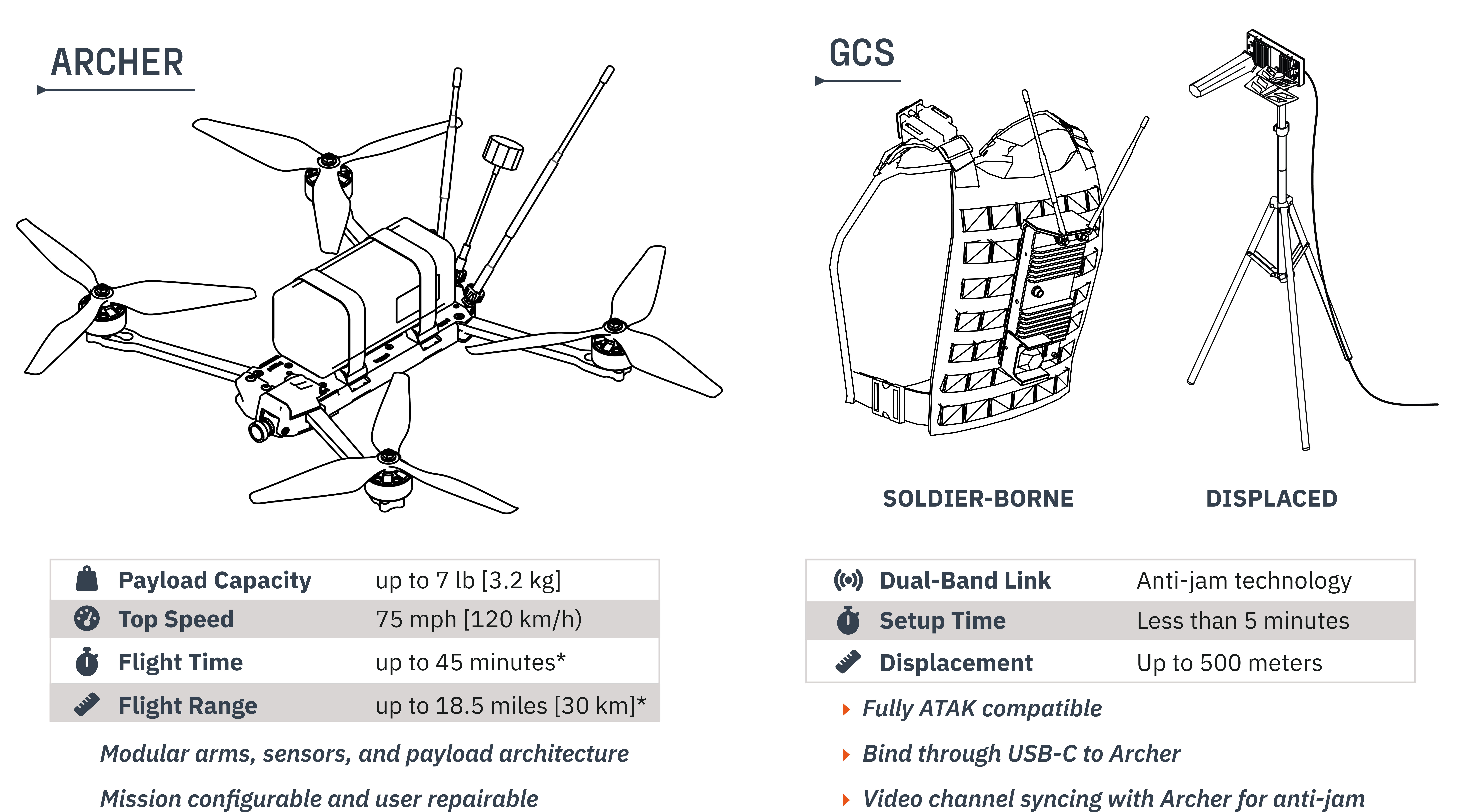 In addition to enhanced, modular FPV drones, the Block 2 system integrates Flatbow, a rugged, soldier-borne Ground Control System optimized for dismounted infantry operations. A field pack configuration enables infantry units to transport and deploy up to three FPV drones, while a displaced antenna allows pilot standoff distances of up to 150 meters, improving survivability and tactical flexibility in urban and contested terrain.