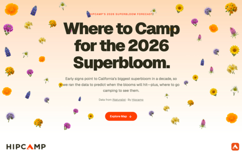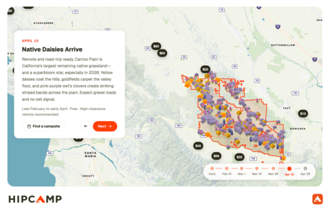 SAN FRANCISCO--(BUSINESS WIRE)--Hipcamp, the world’s #1 app for finding and booking campsites, today launched a brand-new 2026 California Superbloom Forecast: an interactive experience built by analyzing 150,000+ research-grade iNaturalist observations across the 2021–2025 wildflower seasons.