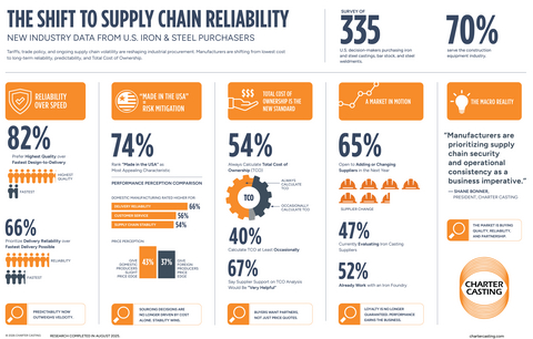 LAS VEGAS--(BUSINESS WIRE)--Tariffs, trade policy and hangovers from prior supply chain disruptions are driving manufacturers to favor risk management and total cost of ownership over traditional cost-optimization models. Charter Casting, the leading provider of innovative cast metal solutions and cast iron bar stock (DuraBar), released new industry data today that indicates manufacturers prioritize reliability and supply chain resilience reflected in domestic stability.