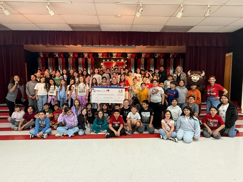 Mo the Buffalo visited Sarah De Amaral to present her with a $10,000 check for the Hutto Education Foundation. De Amaral is a fourth-grade math and science teacher at Veterans Hill Elementary School in Round Rock, Texas.