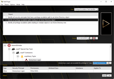 Active Directory Privilege Escalation Path Identifier is the world’s only tooling that can accurately identify privilege escalation paths in Active Directory, because it is the world’s only tooling that bases its determinations on the accurate assessment of effective permissions (/effective access) in Active Directory.