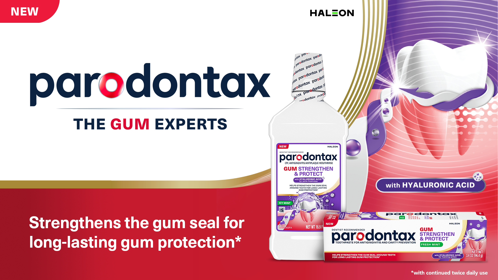WARREN, N.J.--(BUSINESS WIRE)--parodontax, the gum expert brand from Haleon, has launched NEW parodontax Gum Strengthen & Protect Toothpaste and Mouthwash with Hyaluronic Acid^, a daily oral care innovation formulated to strengthen the gum seal where gums and teeth meet for long-lasting gum protection*.