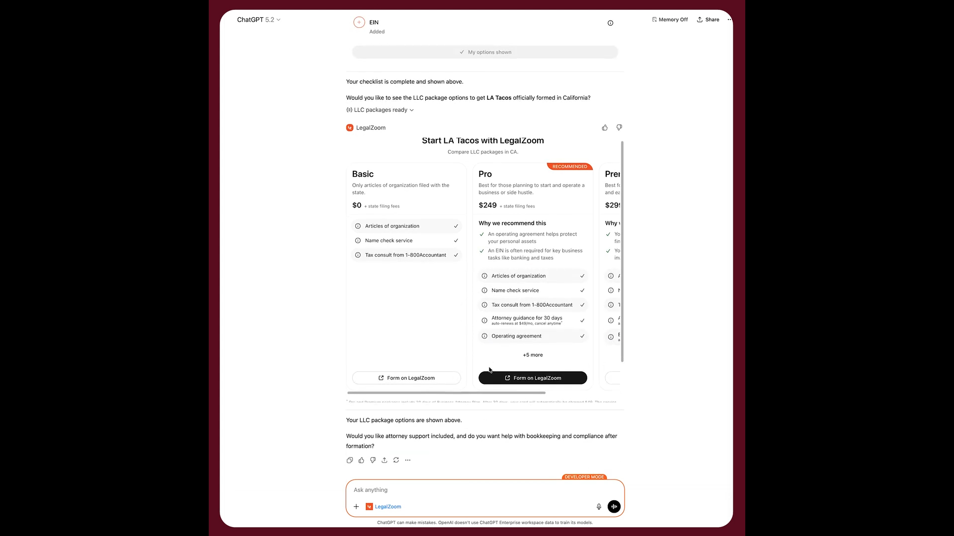 The app is designed to empower ChatGPT users with business formation education and guidance, powered by LegalZoom’s library of attorney-approved up-to-date information. Throughout the experience, LegalZoom helps users understand their business formation options and connect to the right LegalZoom services and independent attorneys when they’re ready to act.