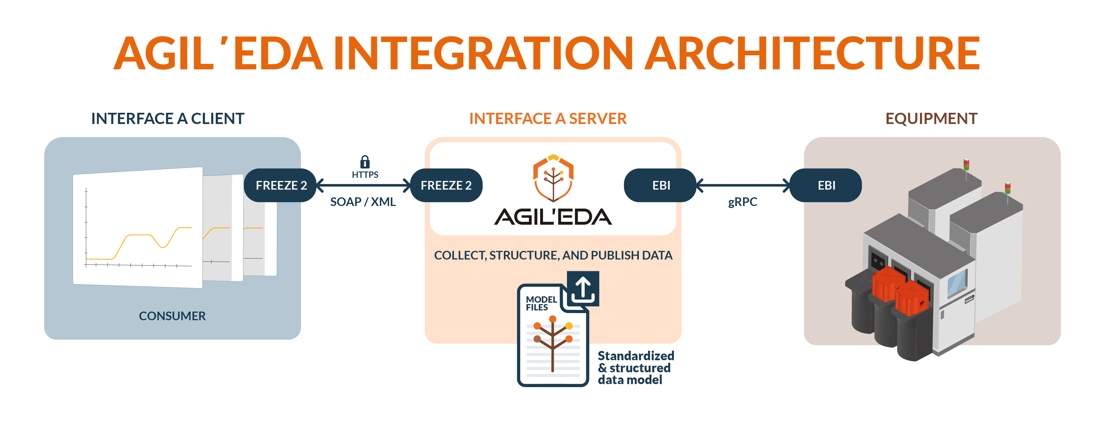 Diseñado para un despliegue a largo plazo, Agil'EDA es totalmente compatible con el estándar EDA Freeze 2 (SOAP/XML), ampliamente utilizado, y está concebido para la transición a Freeze 3 (gRPC/protocol buffers). Esta próxima versión de EDA Freeze, prevista para mediados de 2026, ofrece un rendimiento de datos muy superior y una latencia menor. Agileo logró probar con éxito su implementación de Freeze 3 en las reuniones SEMI Standard Meetings, celebradas en noviembre de 2024.