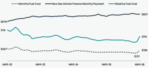 - New vehicle buyers are less vulnerable to fuel price volatility than in prior periods: Even as fuel prices rise, improved fuel economy in newer vehicles has helped keep monthly fuel costs relatively stable for new vehicle buyers. On a relative basis, fuel cost as a percentage of financed monthly payments for gasoline-powered vehicles remains below levels observed four years ago, indicating that today’s buyers are less vulnerable to fuel price fluctuations.