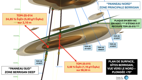 David Grondin, président et chef de la direction de TomaGold, a déclaré : « Cette prochaine phase nous permettra de tester le potentiel de la zone Berrigan Deep, où notre meilleure intersection à ce jour a retourné 5,08 % ÉqZn (1,19 g/t ÉqAu) sur 98,50 m, incluant 23,20 % ÉqZn (5,44 g/t ÉqAu) sur 4,90 m dans le sondage TOM-25-015. À travers ces cinq sondages d’extension, nous visons à recouper le cœur des plaques conductrices modélisées, ce qui pourrait augmenter considérablement le volume de la minéralisation identifiée. »