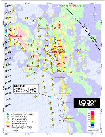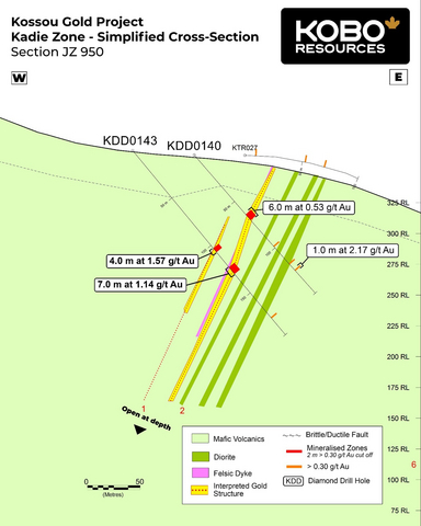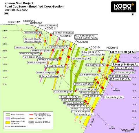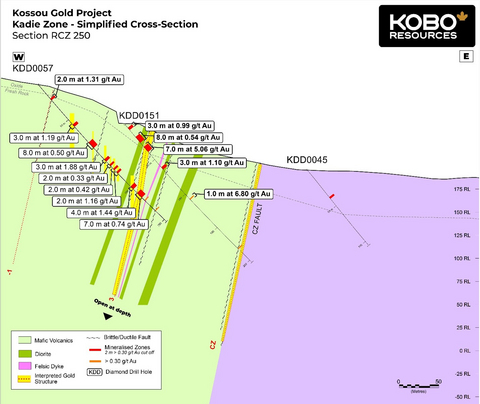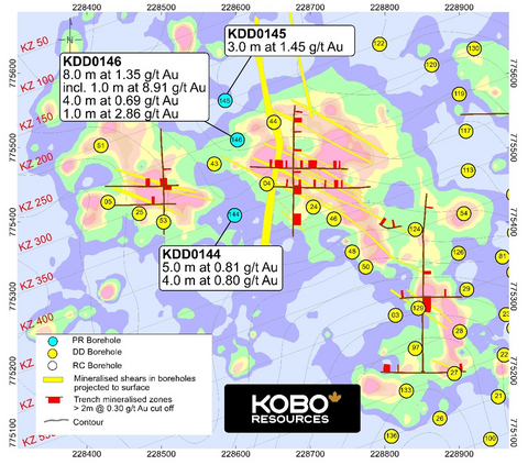 Edward Gosselin, CEO and Director of Kobo commented: “We are extremely pleased with this round of results across all three zones, particularly on the main Road Cut Zone shear where KDD0151 returned 7.0 m at 5.06 g/t Au. The Contact Zone Fault area continues to return promising gold intersections and we see good potential to extend this system further along strike to the north and south. The Kadie Zone has also returned strong gold mineralisation in all three holes drilled and the results confirm that the grades intersected in trenches and near surface drill holes persist to deeper levels.”