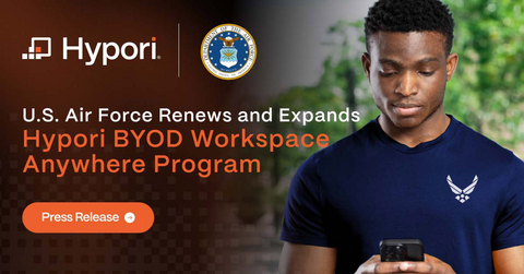 RESTON, Va.--(BUSINESS WIRE)--Hypori, the leading secure virtual mobile infrastructure (VMI) platform, announced today the renewal and expansion of its contract with the Office of the Secretary of the Air Force, Chief Information Officer (SAF/CN). Under the expanded agreement, the Department of the Air Force (DAF) will increase its allocation of Hypori Mobile licenses from 10,000 to 17,000, delivering secure remote access to more Airmen, Guardians, civilians, and contractors across the enterprise.