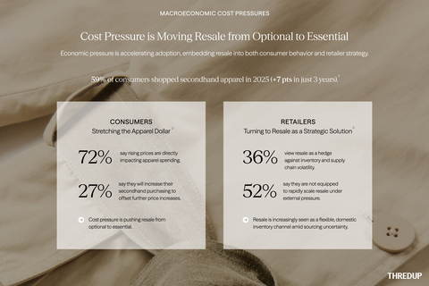 ThredUp’s annual Resale Report contains research and data from GlobalData, a third-party retail analytics firm. GlobalData’s assessment of the secondhand market is determined through consumer surveys, retailer tracking, official public data, data sharing, store observation, and secondary sources. These inputs are used by analysts to model and calculate market sizes, channel sizes, and market shares. Further, for the purpose of this report, GlobalData conducted a January-February 2026 survey of 3,268 U.S. adults over 18, asking specific questions about their behaviors and preferences for secondhand. GlobalData also surveyed the top 50 U.S. fashion retailers and brands from January-February 2026 to gather their opinions on resale. In addition, ThredUp’s Resale Report also leverages data from internal ThredUp customer and brand performance data.
