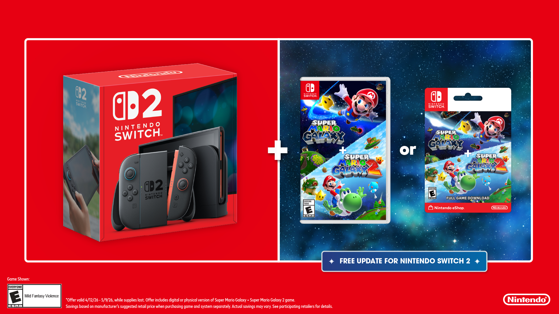 REDMOND, Wash.--(BUSINESS WIRE)--April is shaping up to be a cosmic-sized month for Mario! After seeing The Super Mario Galaxy Movie (in theaters nationwide), players can start their own adventure with a limited-time offer from Nintendo featuring the Nintendo Switch 2 system and the Super Mario Galaxy + Super Mario Galaxy 2 games. From April 12 through May 9, purchase Nintendo Switch 2 at the same time as the physical or digital version of these galactic adventures and save1 $20 at participating retailers such as Amazon, Best Buy, GameStop, Target and Walmart (available online and/or instore at select locations). For more information, visit: https://www.nintendo.com/us/retail-offers/.