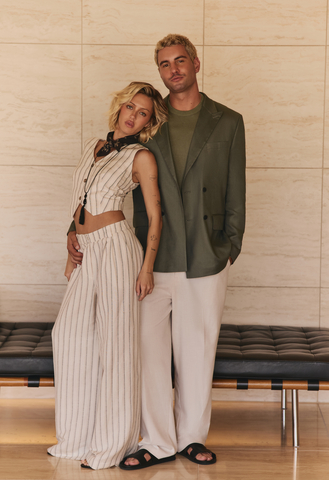 The summer collection features bold occasion dresses and linen sets for women, including the Mixed Media Scoop Neck Drop Waist Maxi Dress, Linen-Blend Striped Cropped Blazer Vest and Linen-Blend Striped High Waisted Relaxed Trouser. For men, the focus turns to modern suiting that feels effortless and warm-weather-ready, including the Slim Pearl White Cotton-Blend Double Breasted Seersucker Suit Jacket and Slim Pearl White Cotton-Blend Seersucker Suit Pant. Delilah and Mick also curated their own personal edit of the collection, available to shop now at express.com/it-couple.