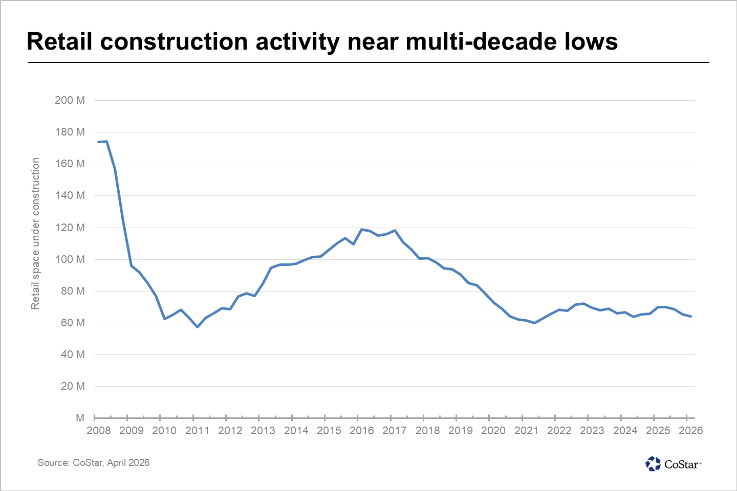 In Q1 2026, roughly 64.2 million square feet of retail space was under construction in the U.S., down from approximately 70 million square feet a year earlier and well below the 10-year average, which consistently exceeded 90 million square feet during the last expansion cycle.