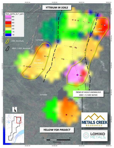 These results are from additional REE analysis from the Phase II soil sampling and prospecting program (See News Release September 23, 2025) on the Yellow Fox Antimony property and follow-up to the initial 7 samples assayed for REE’s (See News release January 14, 2026). Lomiko acquired the Yellow Fox Project from Metals Creek in 2025. (See MEK news release dated January 21st, 2025).