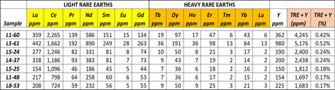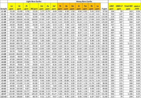 Results from these 32 assays (See Table 2) continue to exhibit strong LREE enrichment (La-Ce-Pr-Nd-Eu) accompanied by highly elevated HREE (Dy-Tb-Ho-Er-Tm-Yb-Lu), including Yttrium (Y), over a minimum length of 1200m, indicating a mixed LREE and HREE mineralized system hosted by what is interpreted to be a highly fractionated peralkaline granite. These peralkaline granites are considered to be one of the primary hosts for HREE enriched systems. Assays revealed an enriched REE system with highly anomalous HREEs, including Dysprosium (Dy) and Terbium (Tb), with select samples up to 10 to 20 times background (See Figure 1).