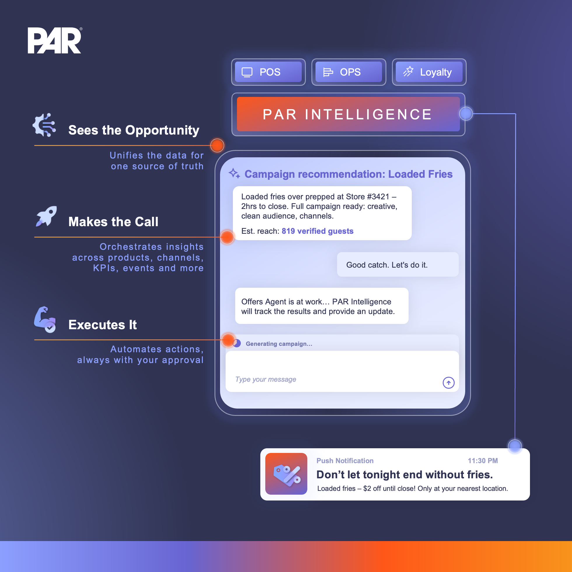 Unlike a point solution or a standalone AI tool, PAR Intelligence is a platform-wide agentic layer woven through the PAR® product ecosystem. PAR Intelligence sees the opportunity, makes the call, and delivers the outcome.