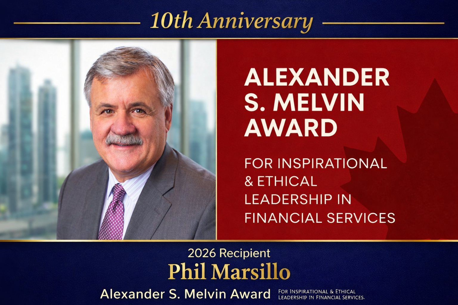 The Alexander S. Melvin Leadership Award recognizes individuals in the Canadian financial services industry who, through their inspirational and ethical leadership, have changed the industry for the better. Named after industry leader Alex Melvin, who passed away in 2015, the award is given to outstanding professionals who embody his inspirational and ethical leadership and who demonstrate a collaborative spirit and willingness to help others succeed.