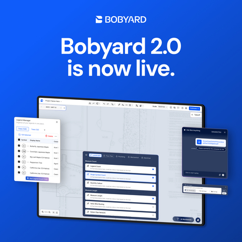 SAN FRANCISCO--(BUSINESS WIRE)--Bobyard, the AI platform transforming how contractors perform construction takeoffs and estimates, today announced the launch of Bobyard 2.0, a major platform update that delivers faster takeoff workflows, a consolidated AI workbench, and an experience built to move as fast as the estimators who rely on it every day.