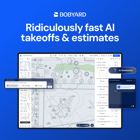 The update also consolidates all AI tools into a single, unified AI Workbench, making Bobyard's computer-vision capabilities more intuitive to deploy and easier to trust. A new Review Workflow surfaces confidence levels for every AI-generated output, giving estimators greater control over quality before committing results to their takeoff. Additional improvements include a redesigned navigation experience, cross-page search, and a streamlined path from completed takeoff to production-ready estimate — all without leaving the platform.