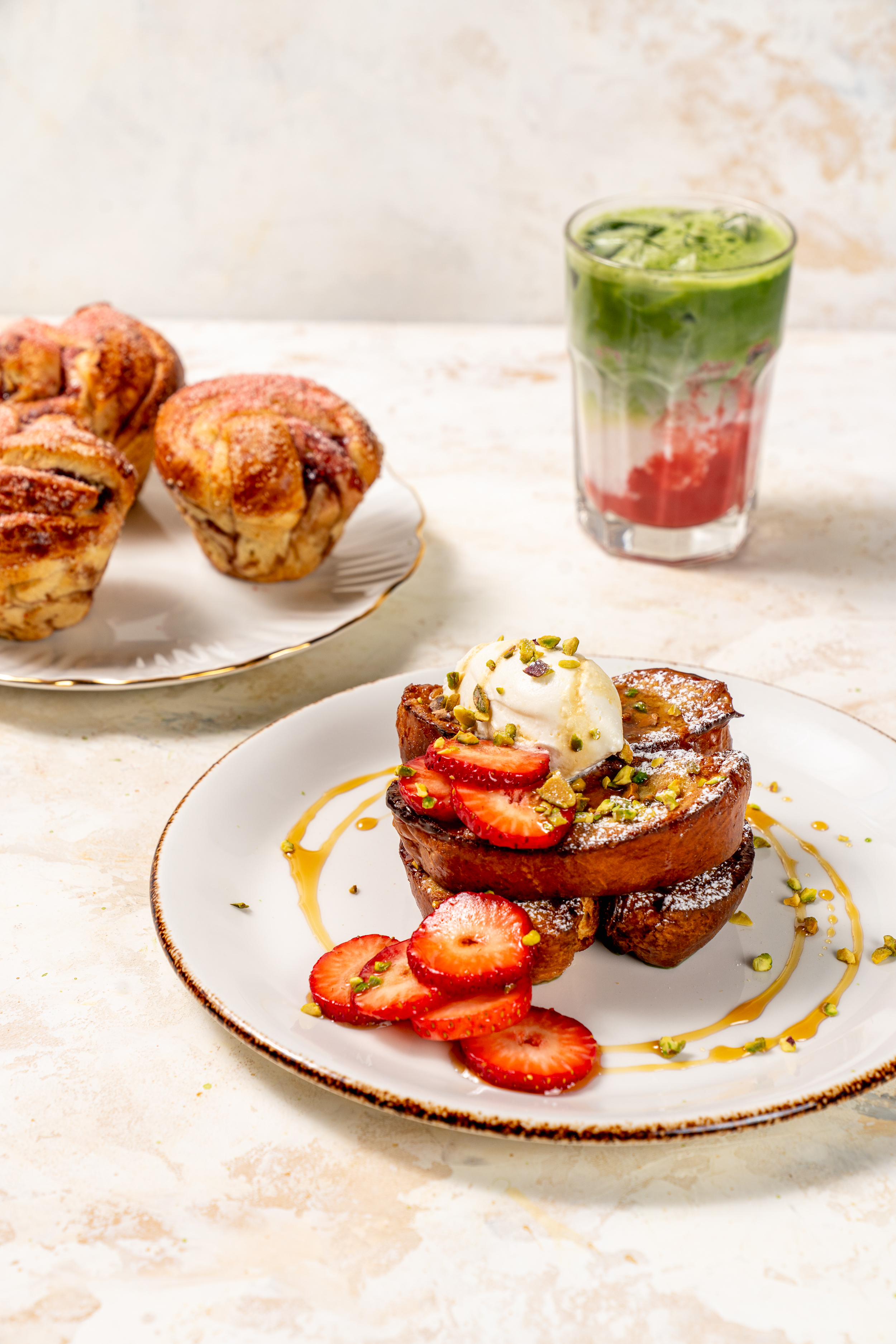 - Pistachio Strawberry French Toast: House-made brioche baked with a layer of creamy pistachio almond frangipane on top, topped with crushed pistachios, sweet and airy Chantilly cream (you may recognize from their signature French Cream Doughnut), fresh strawberries, and a delicate drizzle of maple syrup.