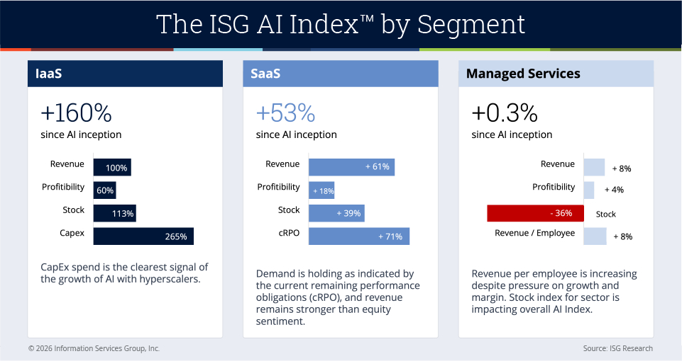 The ISG AI Index measures each of the three market segments through a combination of key performance indicators: revenue, profitability and stock price performance, along with one forward-looking AI indicator unique to each segment.