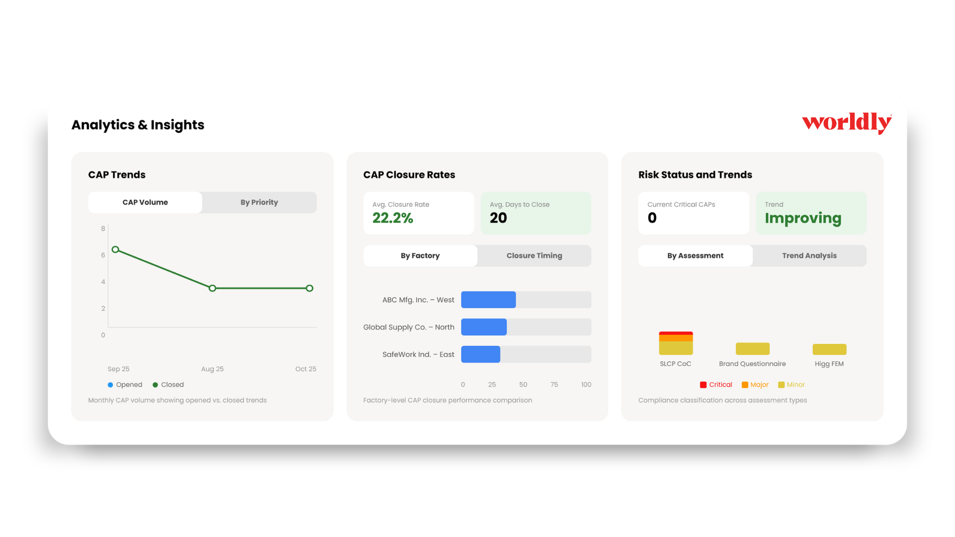 "We've spent years building the largest network of verified supplier data in the consumer goods industry, with more than 40,000 facilities submitting primary data on the Worldly platform," said Kathryn Smith, Vice President, Human Rights Risk Solutions at Worldly. "Supplier Compliance Management turns that foundation into something compliance teams have never had before: a single system that connects what audits find to what a brand's own standards require, and tracks whether conditions are actually improving. That's not incremental. It changes how compliance programs operate."