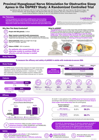 LONDON--(BUSINESS WIRE)--LivaNova PLC (Nasdaq: LIVN), a market-leading medical technology company, today announced that the journal Annals of Internal Medicine has published an article chronicling the full 12-month data set for the Company’s OSPREY randomized controlled trial (RCT). The researchers evaluated the safety and efficacy of proximal hypoglossal nerve stimulation (pHGNS), a differentiated neurostimulation modality, when delivered by LivaNova’s aura6000™ System for the treatment of moderate to severe Obstructive Sleep Apnea (OSA). Overall, the authors concluded that pHGNS for OSA yielded clinically significant improvements versus the control at month (M) 7 with sustained improvements through M13 of OSPREY, corresponding with six and 12 months of therapy, respectively, providing unique RCT evidence for clinically relevant improvements in apnea-hypopnea index (AHI), sleep quality, and patient-reported outcomes (PROs). LivaNova previously announced 12-month, top-line data from the OSPREY trial in May 2025.