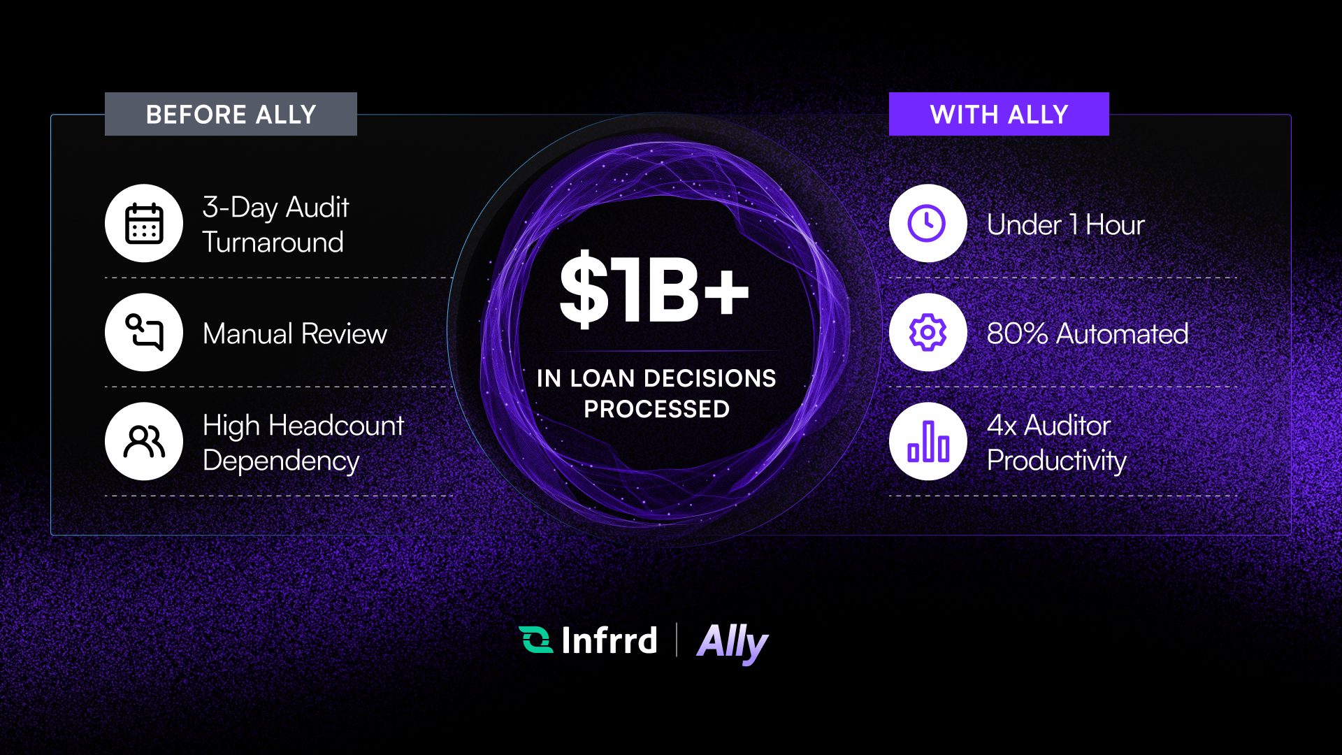 Infrrd's Ally: Before vs. After Mortgage Audit Automation. One of the country's top 10 mortgage lenders has cut audit turnaround time from 3 days to under 1 hour using Ally, Infrrd's mortgage-native agentic AI auditor. Ally automates up to 80% of the audit process, delivers 4x auditor productivity, all without increasing headcount. Purpose-built for mortgage audit teams, Ally replaces manual document review and high headcount dependency with end-to-end intelligent automation across 600+ document types.