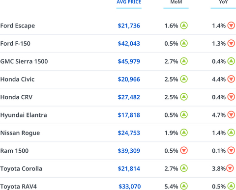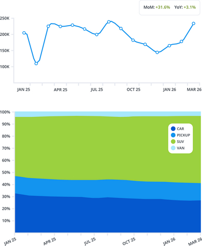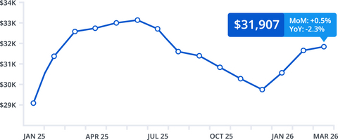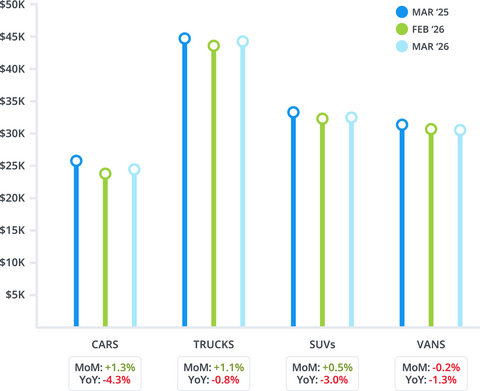 • The national average used vehicle listing price reached $31,907 in March — up 0.5% month-over-month and down 2.3% year-over-year.