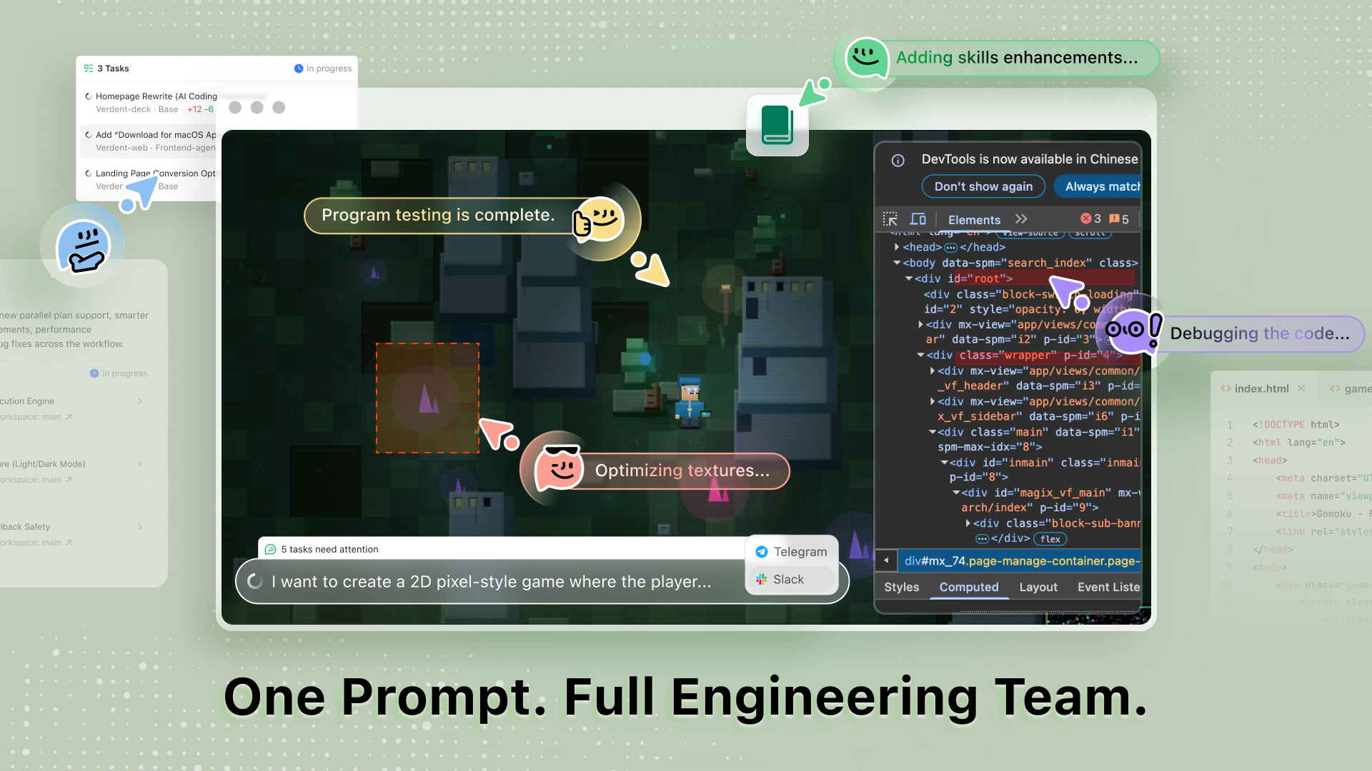 That is what Verdent is designed to do: carry work from a rough idea to something deployed and running—breaking goals into tasks, selecting the right tools, writing and testing code, and continuing asynchronously through Slack or Telegram even when users step away. It also retains context across sessions, including stack choices, prior decisions, and what has already been built, so users can keep moving without starting over.