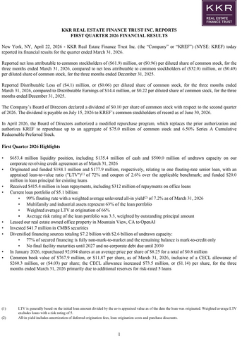 NEW YORK--(BUSINESS WIRE)--KKR Real Estate Finance Trust Inc. (“KREF”) (NYSE: KREF) today reported its first quarter 2026 results, which have been posted to the Investor Relations section of KREF’s website at http://www.kkrreit.com/investor-relations/events-and-presentations.