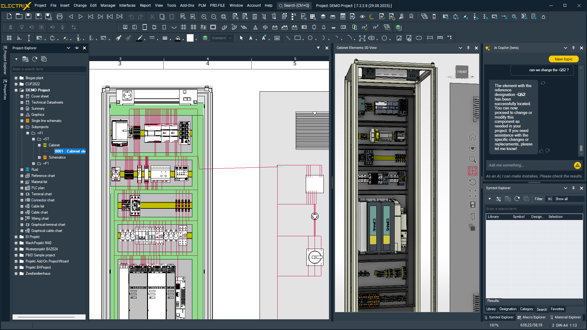 ELECTRIX AI helps users work efficiently across tasks, from importing schematic data, exchanging components, and validating project requirements and compliance to translating documentation and automatically generating control cabinets, wiring and finished design files.