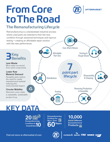 AUBURN HILLS, Mich.--(BUSINESS WIRE)--In recognition of Global Reman Day, ZF Aftermarket highlights how its reman portfolio helps customers maximize mobility uptime while supporting sustainability goals and strengthening supply chain resilience. Through controlled, standardized industrial processes that return used components to as-new condition, ZF provides a dependable alternative to new parts without compromising quality or performance.