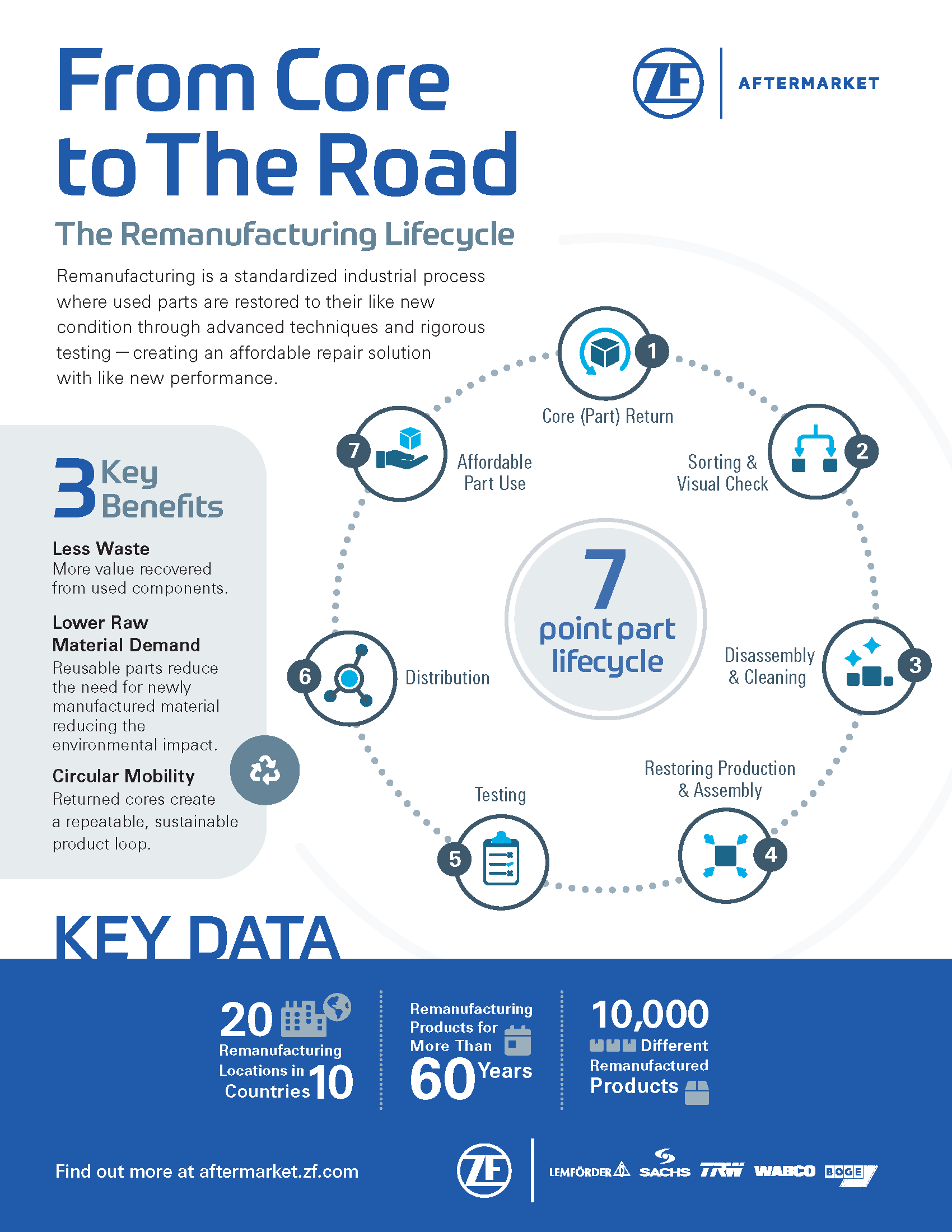 - ZF Aftermarket highlights how remanufacturing (Reman) helps customers maximize mobility uptime, while improving supply chain resilience and supporting sustainability goals.