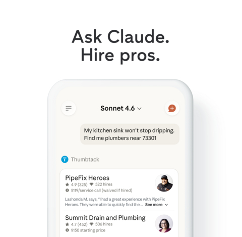 SAN FRANCISCO--(BUSINESS WIRE)--Today, Thumbtack announced a new integration with Anthropic’s Claude, bringing its home services marketplace directly into the AI assistant experience. Claude users on Free, Pro, and Max plans can now move from asking home-related questions to finding, comparing, and hiring top-rated local professionals from Thumbtack — all within the Claude interface.