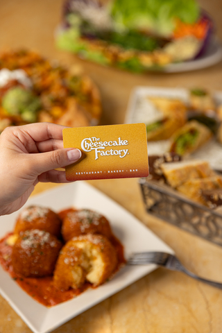 - Subject to availability, purchaser will receive one $10.00 Bonus Card for every $50.00 worth of The Cheesecake Factory gift cards purchased online in a single transaction from 04/27/2026 through 05/10/2026 at https://www.thecheesecakefactory.com/gift-cards. Bonus Cards may be used beginning 05/11/2026 and expire 06/03/2026 (end of business day). Promotion may be terminated at any time. Bonus Cards may not be used in conjunction with any other discount or offer. Full terms and conditions, including additional restrictions on the use of Bonus Cards, are available at https://www.thecheesecakefactory.com/gift-cards.