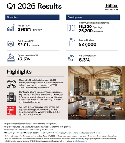 MCLEAN, Va.--(BUSINESS WIRE)--Hilton Worldwide Holdings Inc. ("Hilton," "the Company," "we," "us" or "our") (NYSE: HLT) today reported its first quarter 2026 results. Highlights include: